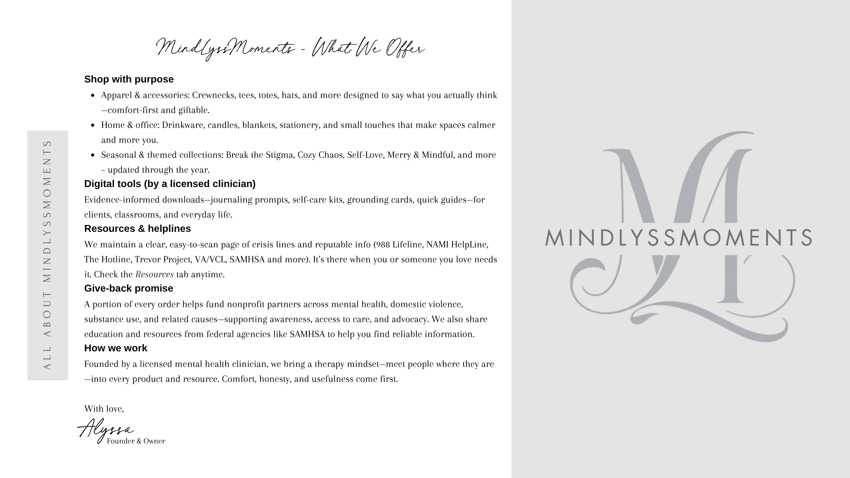 MindLyssMoments products are made for comfort and conversation — not as a replacement for therapy or professional care. Any wellness-related claims are based on personal experience, not clinical evidence. If you're struggling, please reach out to a licensed provider or call/text 988 for 24/7 support. 💚