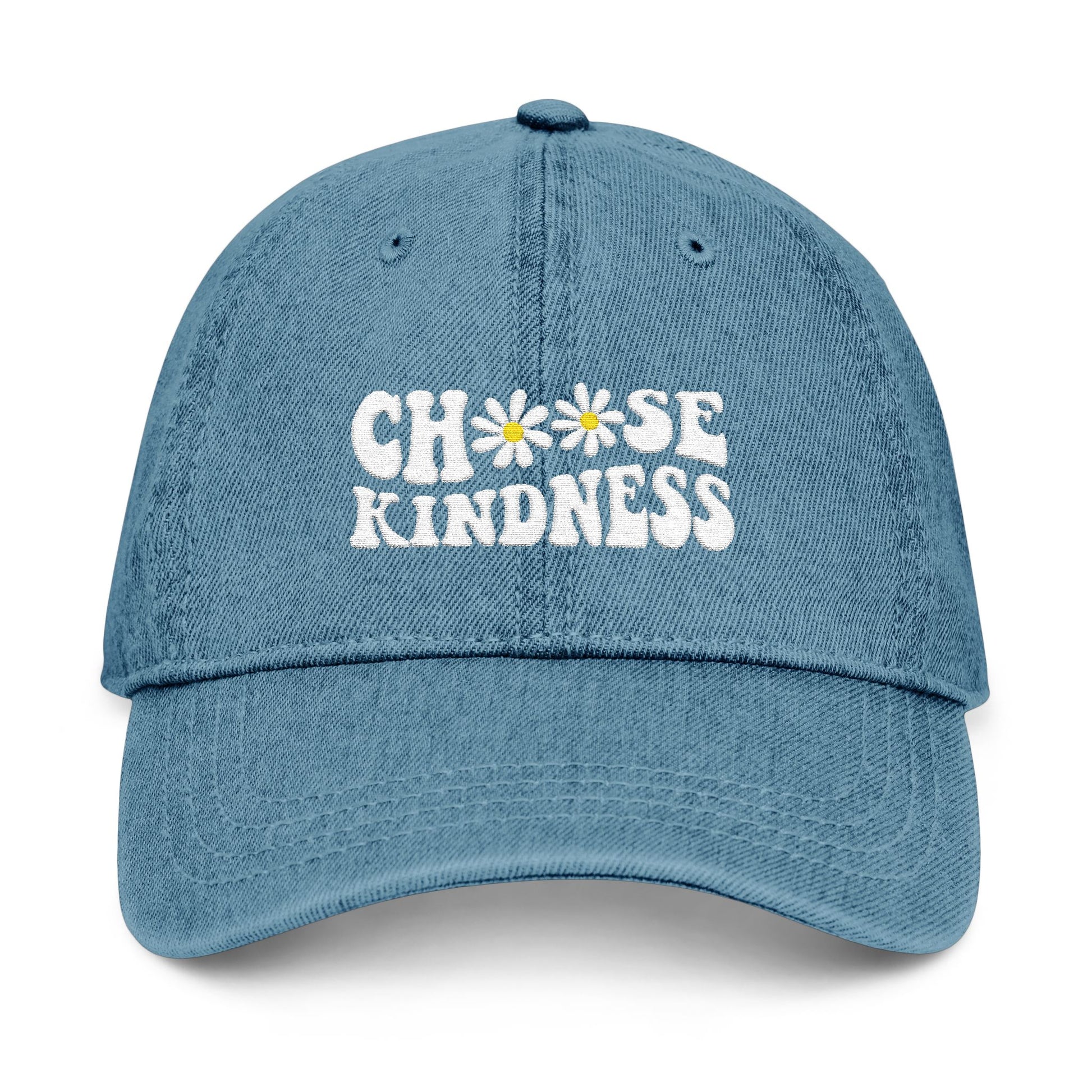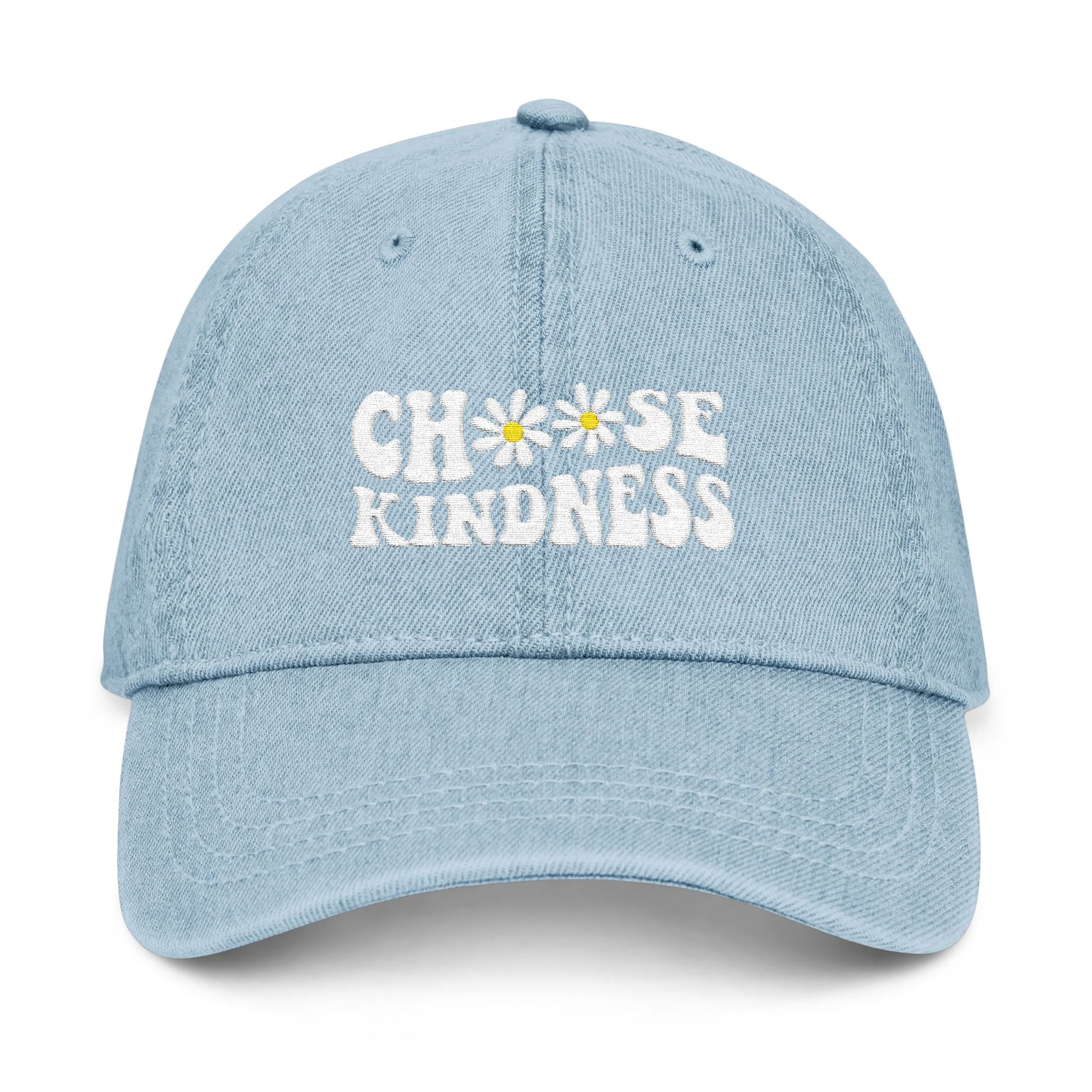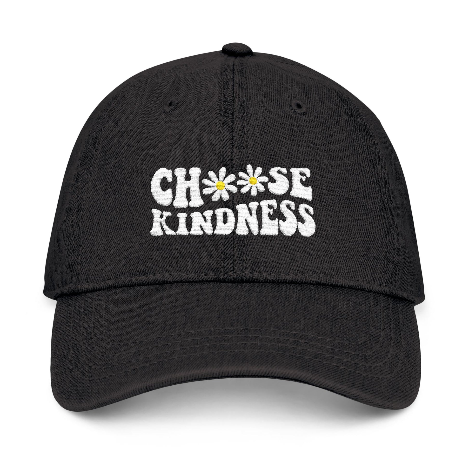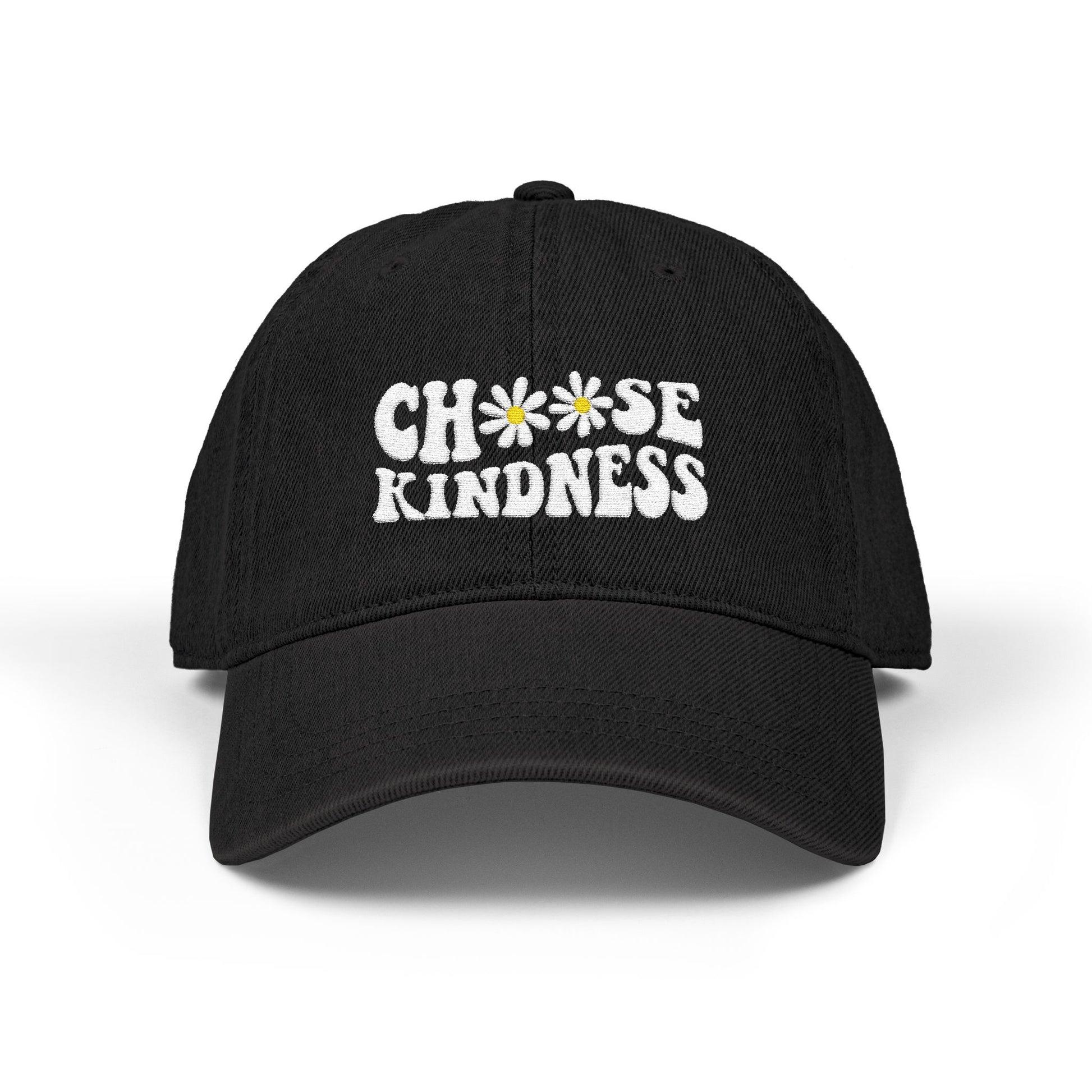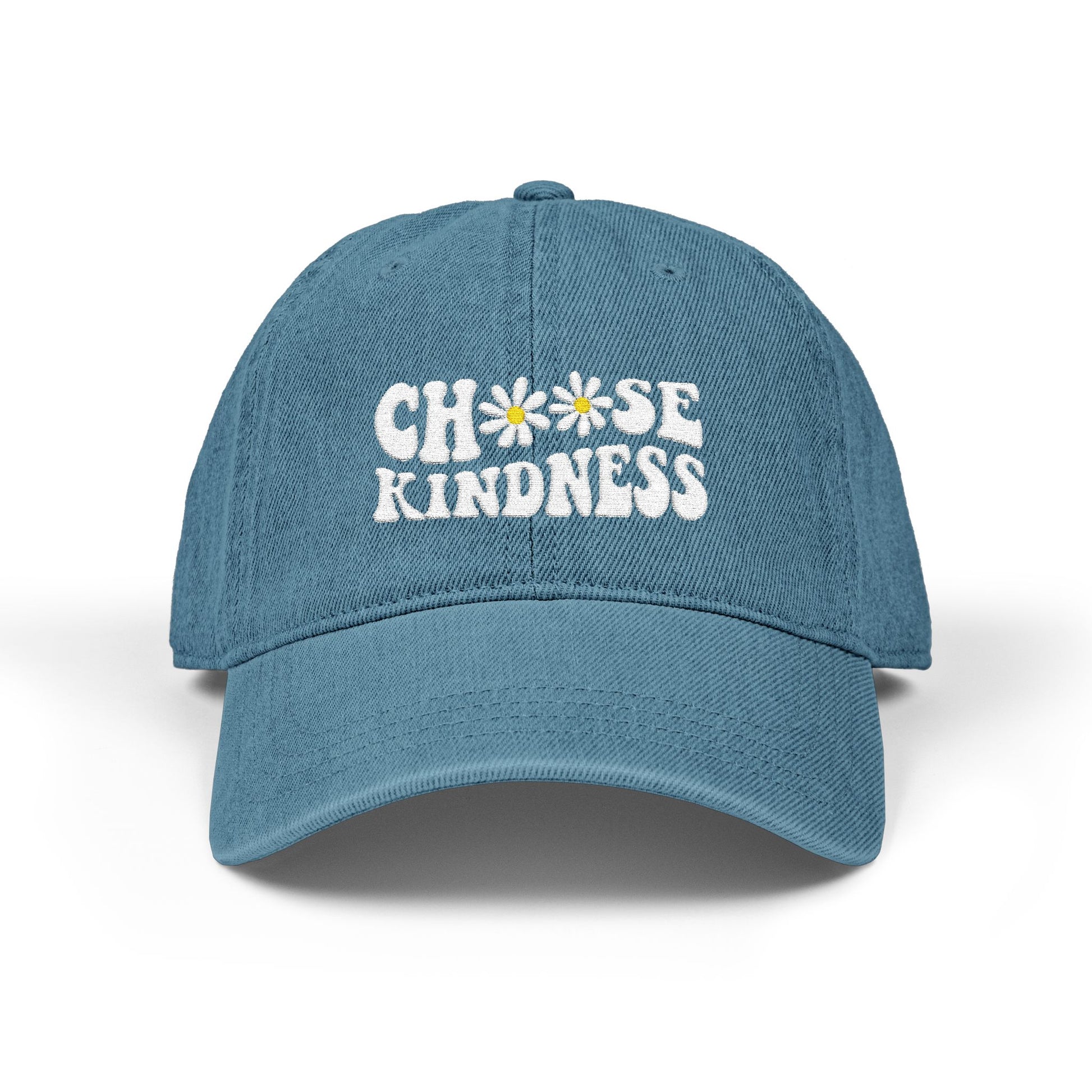 A daily reminder to always choose kindness . This 100% cotton denim hat offers vintage, pigment-dyed comfort with a relaxed fit, breathable eyelets, and an adjustable strap—perfect for self-care days, errands, or dodging burnout in style.