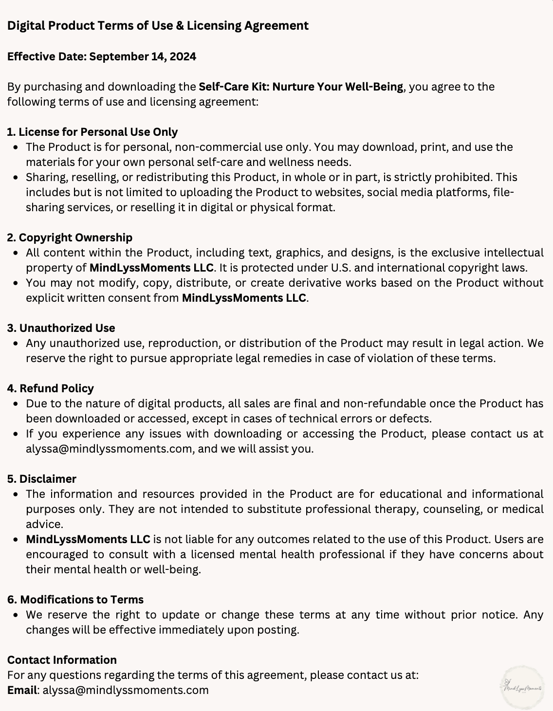 Your well-being deserves attention and care, and the Self-Care Kit is designed to help you cultivate a nurturing self-care routine. Whether you're dealing with stress, burnout, or just need a moment to reset, this digital bundle includes essential tools to enhance mindfulness, reduce anxiety, and bring balance into your daily life.