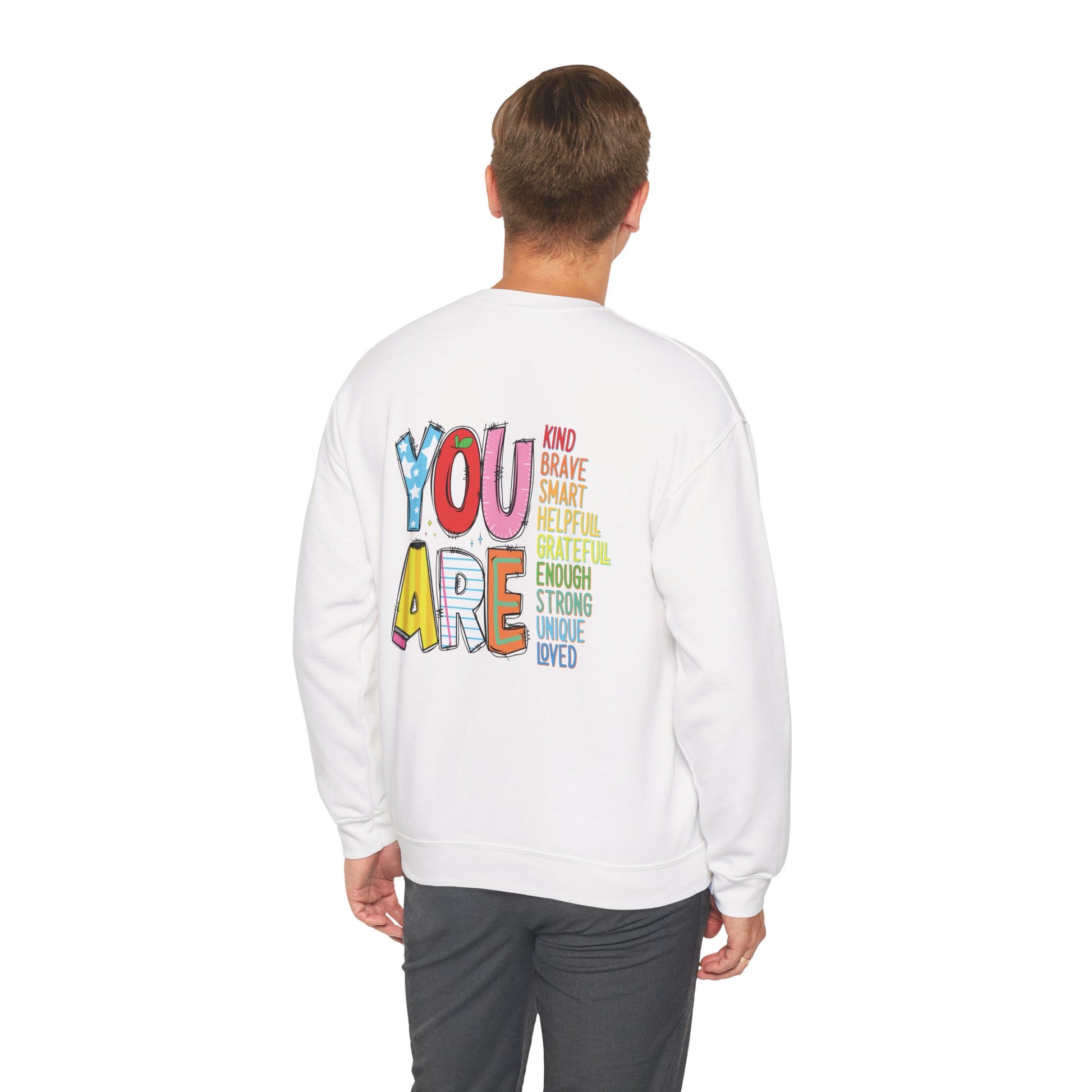 A wearable affirmation for every classroom. This uplifting design reminds students of all the incredible things they already are — kind, brave, smart, helpful, grateful, enough, strong, unique, and loved. Created for teachers who believe in the power of positive words, this crewneck helps build confidence and warmth every time you wear it. Whether you’re greeting students at the door or wrapping up a long day, it’s a cozy reminder that encouragement can change everything.